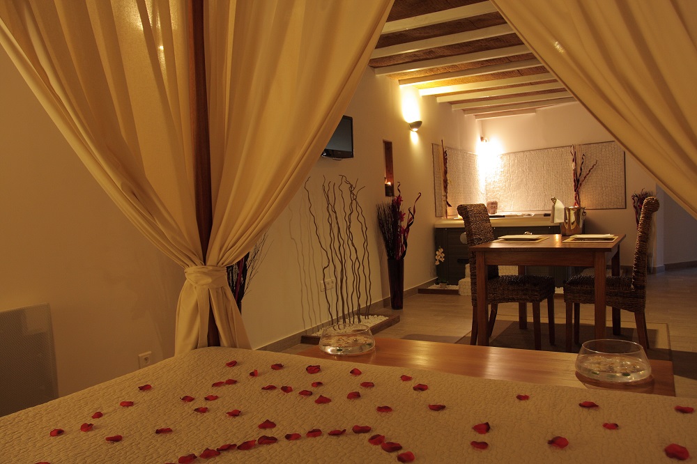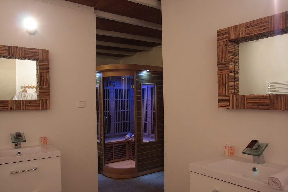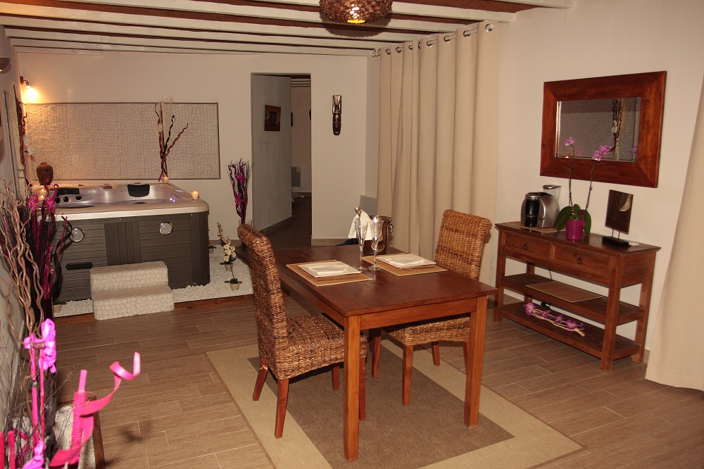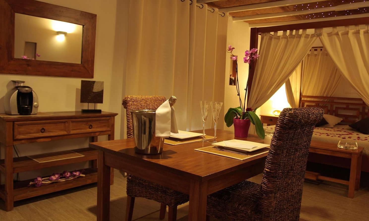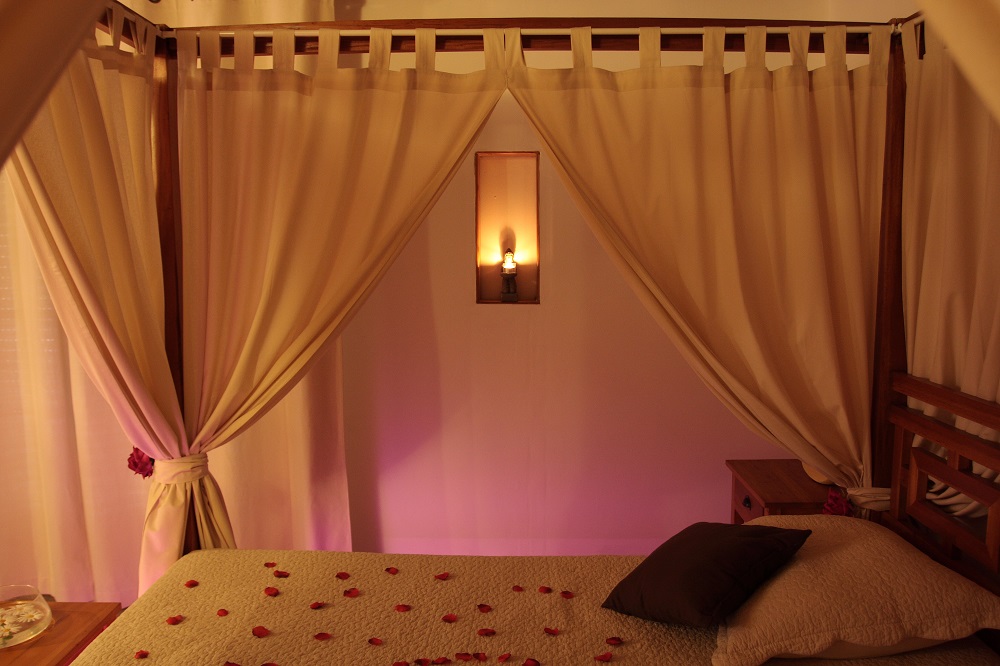 Dans cette très grande suite climatisée avec spa et sauna privatif, avec son accès indépendant et sa grande terrasse extèrieure avec fontaine, ainsi que son parking privatif securisé,vous découvrirez un décor exotique surmonté d'un plafond en coco orné d’un ciel étoilé multicolore.