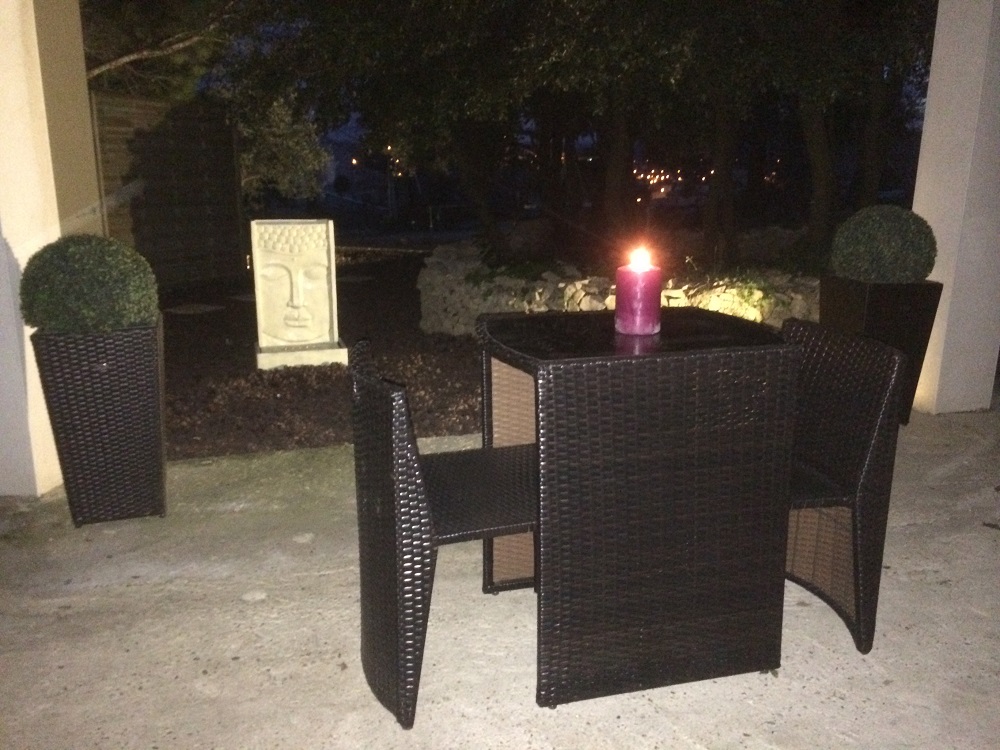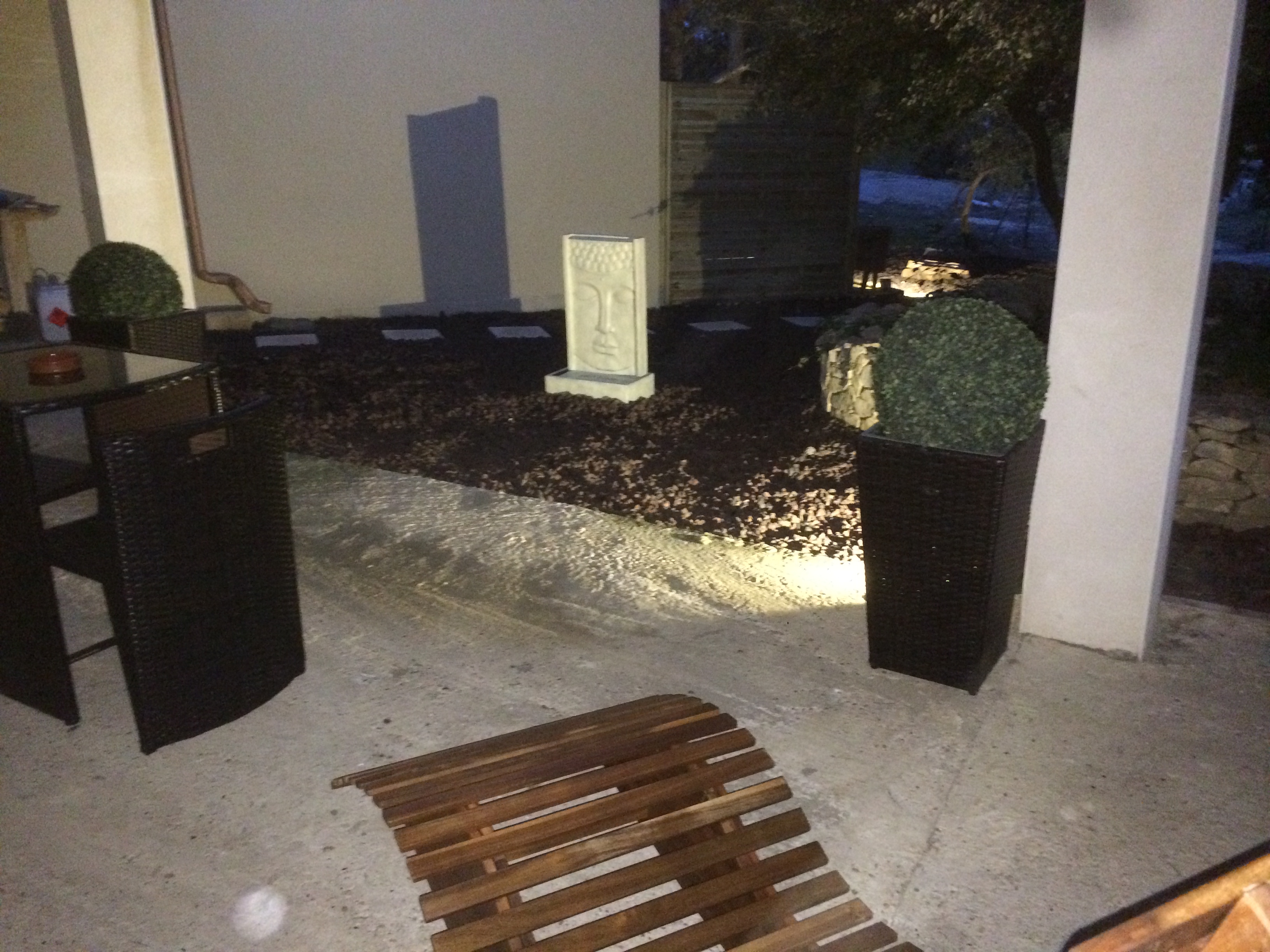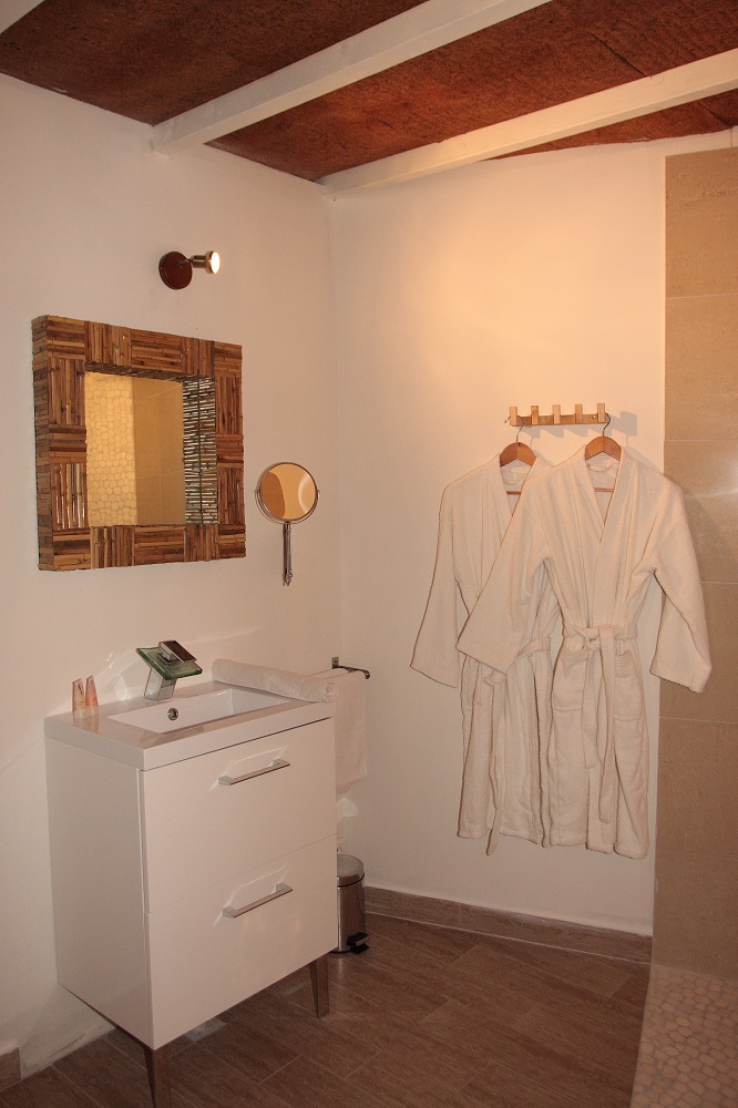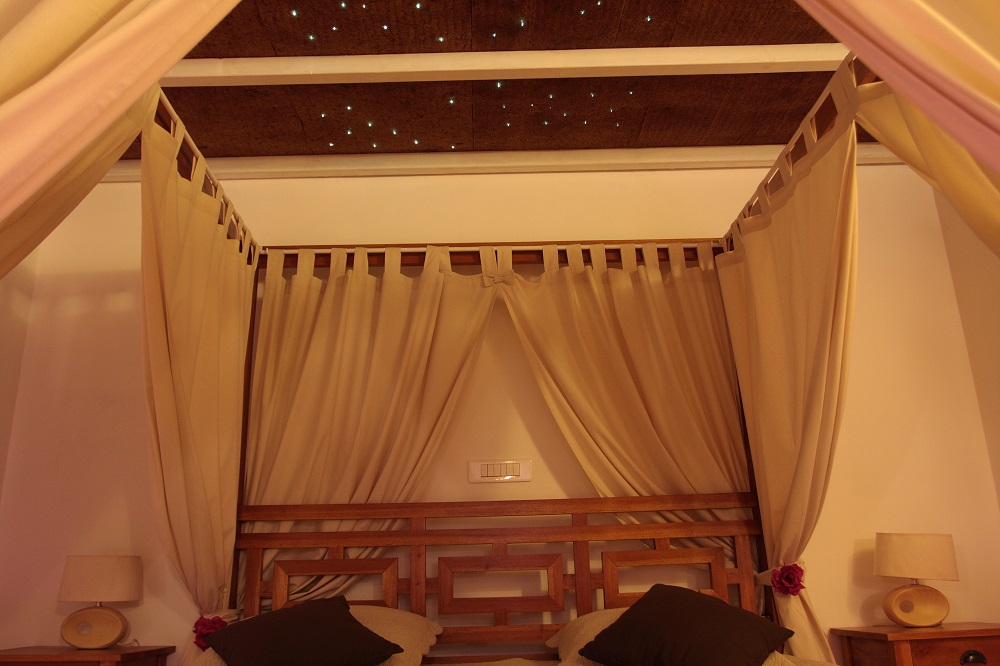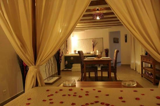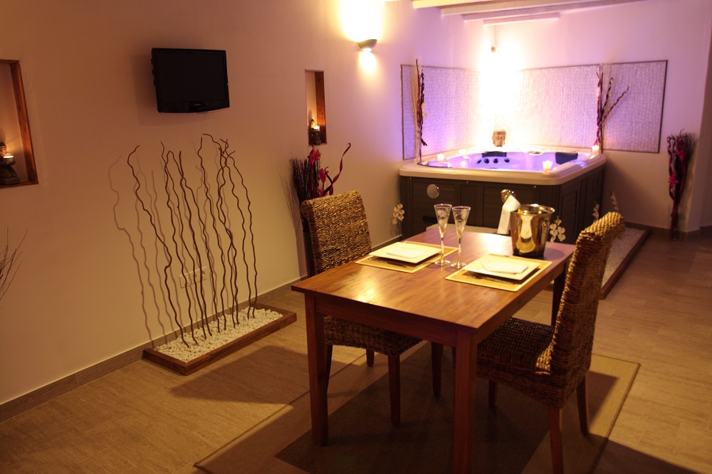 Dans cette très grande suite climatisée avec spa et sauna privatif, avec son accès indépendant et sa grande terrasse extèrieure avec fontaine, ainsi que son parking privatif securisé,vous découvrirez un décor exotique surmonté d'un plafond en coco orné d’un ciel étoilé multicolore.