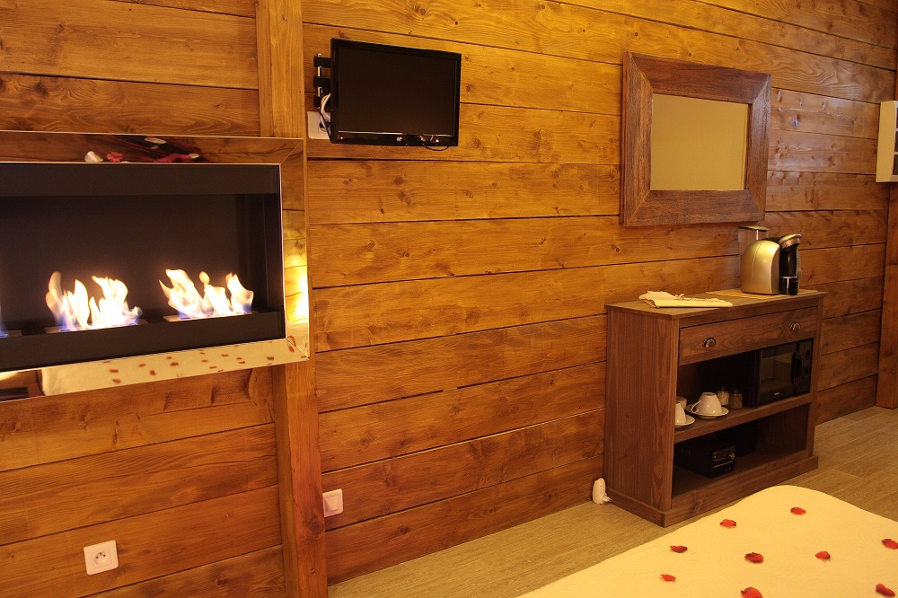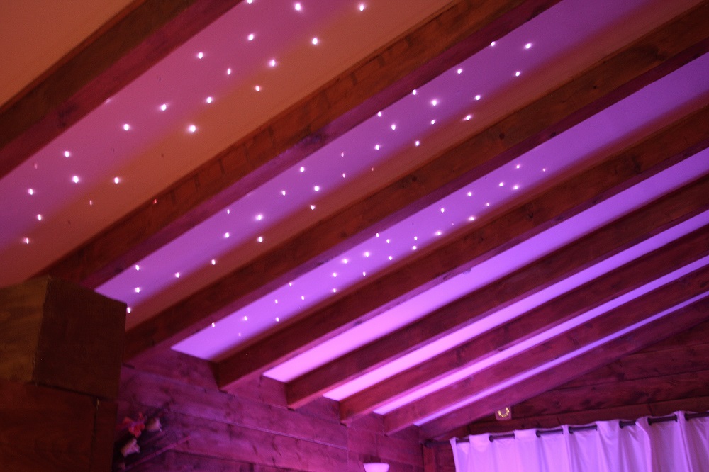 vous découvrirez un décor romantique surmonté d'un plafond en poutres apparentes, orné d’un ciel étoilé multicolore, et d'un magnifique feu de cheminée.