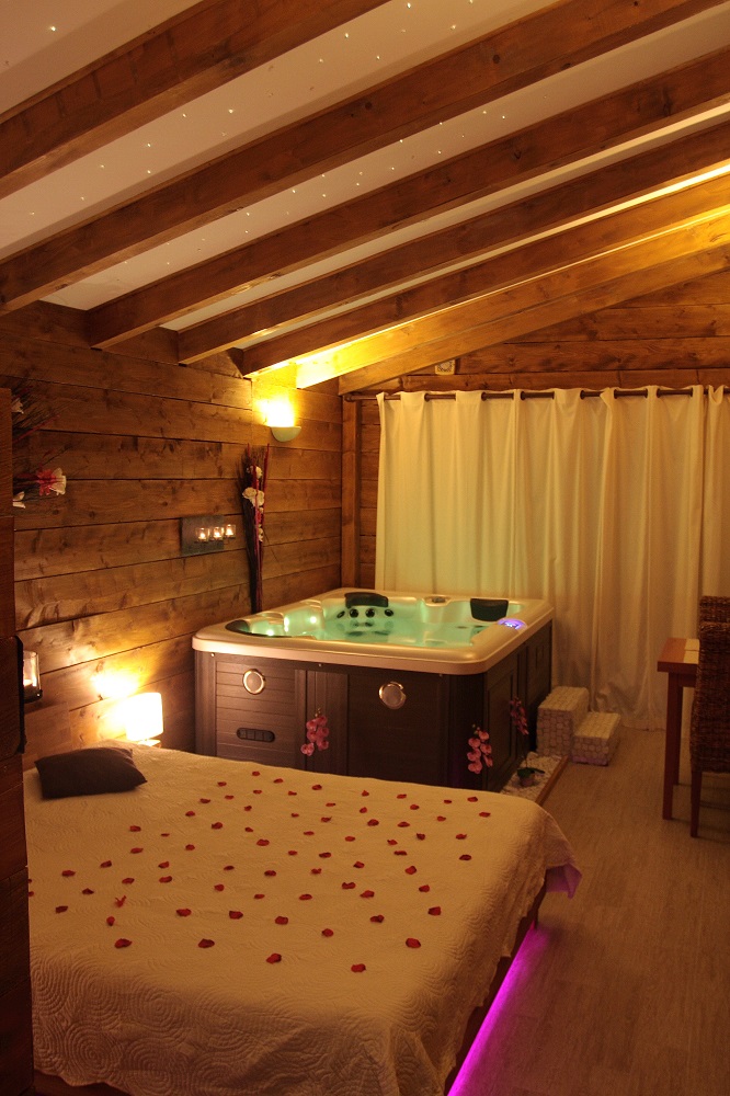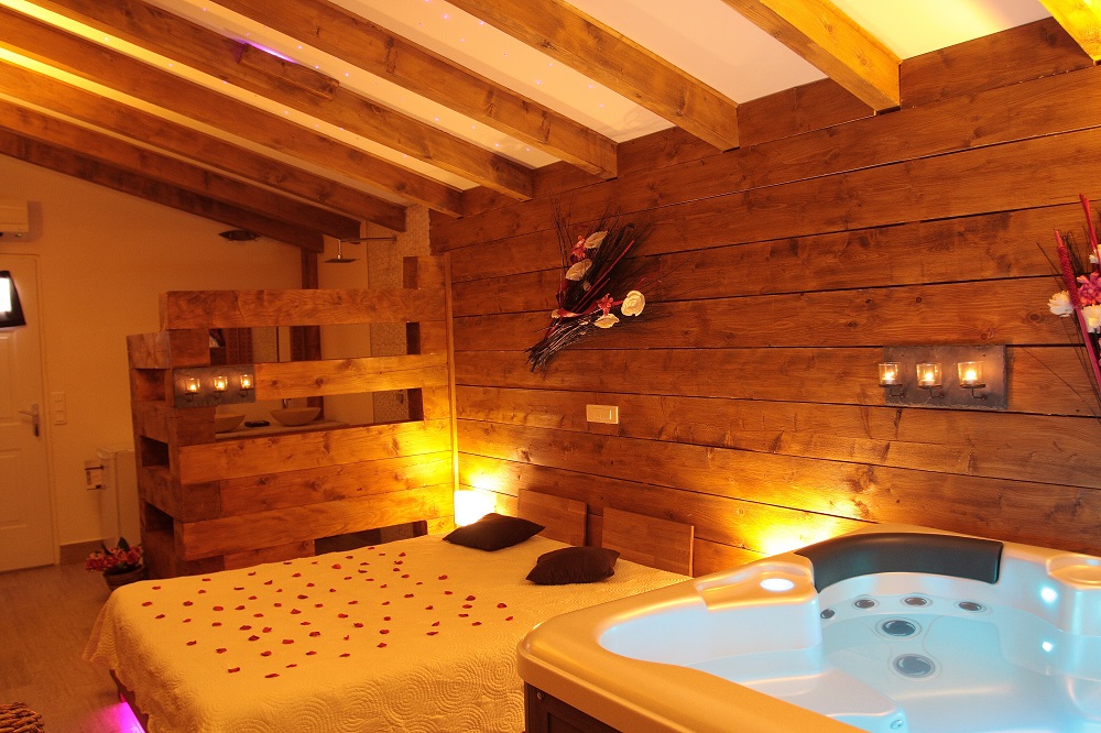 Dans cette suite climatisée avec spa et cheminé bio éthanol avec un accès indépendant, et une terasse extèrieure avec table et chaises, ainsi que son parking privatif sécurisé